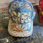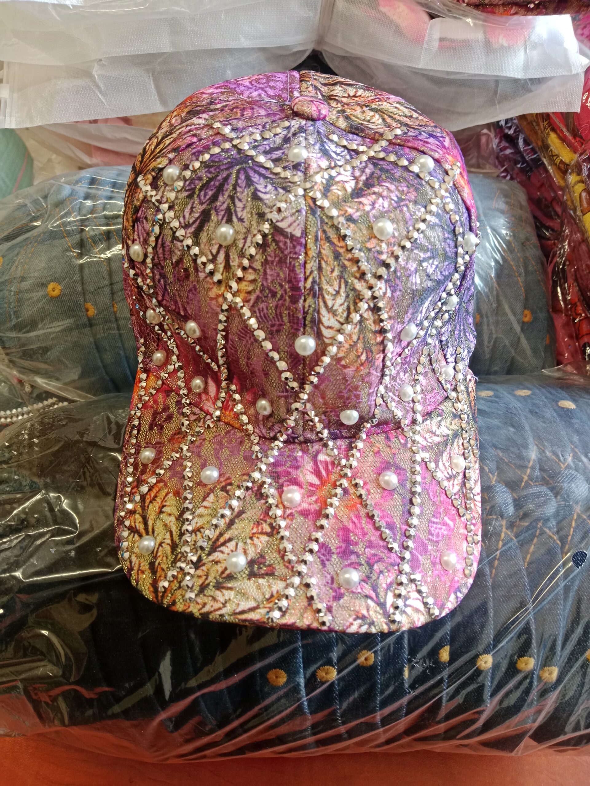 Pink and purple fashionable baseball cap with rhinestones and faux pearls